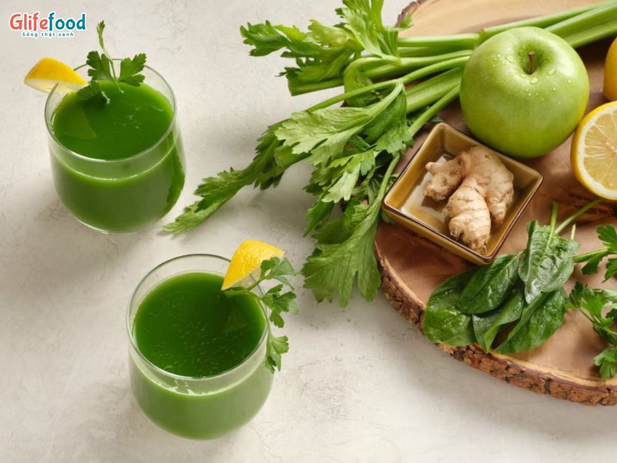Lợi ích: Táo và cần tây giàu chất xơ giúp tiêu hóa khỏe mạnh. Chanh hỗ trợ quá trình thải độc và cung cấp vitamin C. Cần tây cũng có đặc tính lợi tiểu nhẹ, giúp giảm giữ nước.