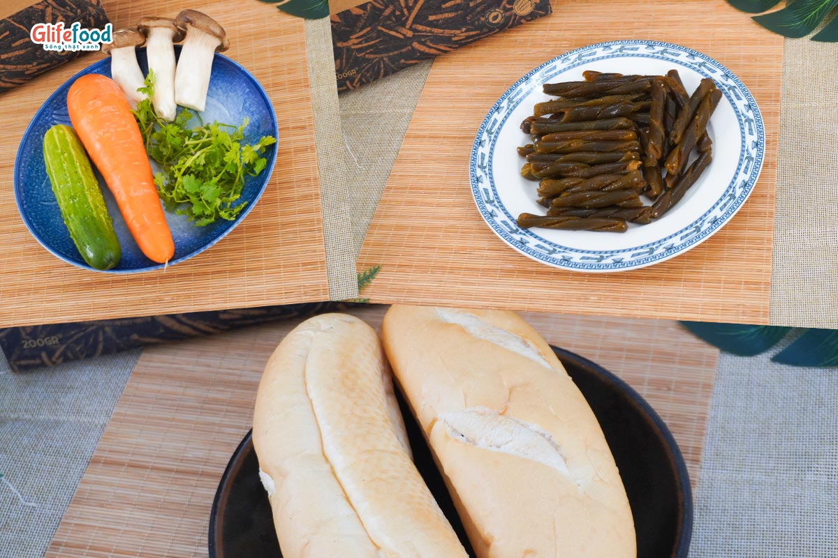 Bánh mì, dưa chuột, cà rốt, rau mùi