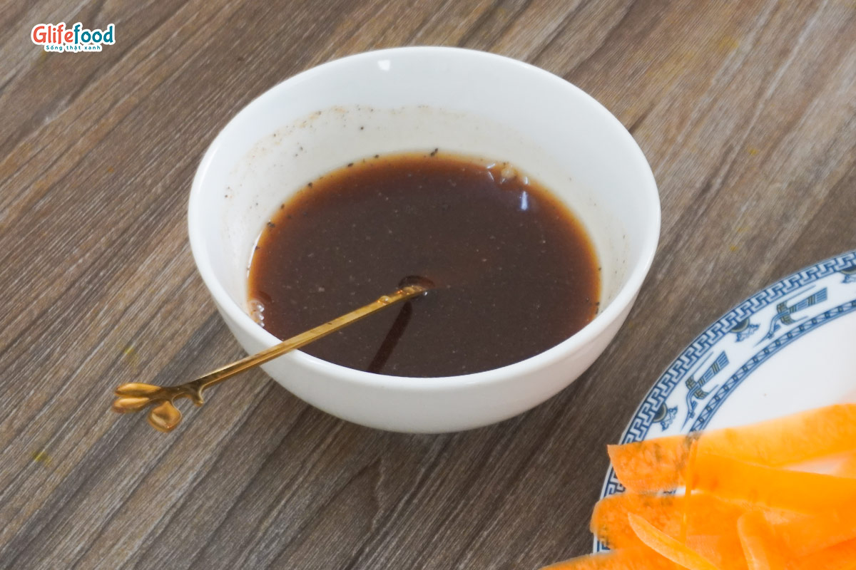 Sốt tiêu đen: Phi thơm tỏi với bơ rồi thêm 2 thìa canh nước tương, 1 thìa canh tương ớt, 1 thìa canh dầu hào, 1 thìa canh tiêu xay, 1 thìa canh đường, 6 thìa canh nước. Đợi sốt sôi lăn tăn thì thêm 1 thìa cafe bột bắp pha loãng. Cho tảo vào xào chín.