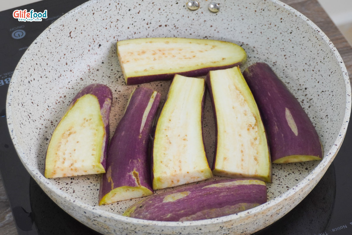 Cà tím áp chảo hoặc nướng chín, sau đó bỏ vỏ, lấy ruột và cắt nhỏ cà tím.