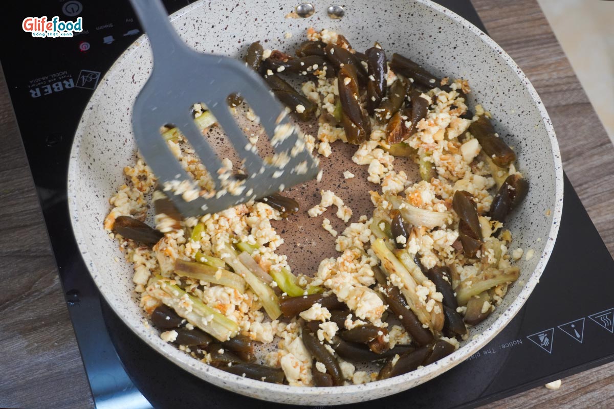 Đậu phụ bóp nát rồi xào đến khi đậu phụ vàng khô. Thêm tảo biển Chile thái nhỏ, cà tím, 1/3 thìa cafe muối, tiêu xay vào xào chín.