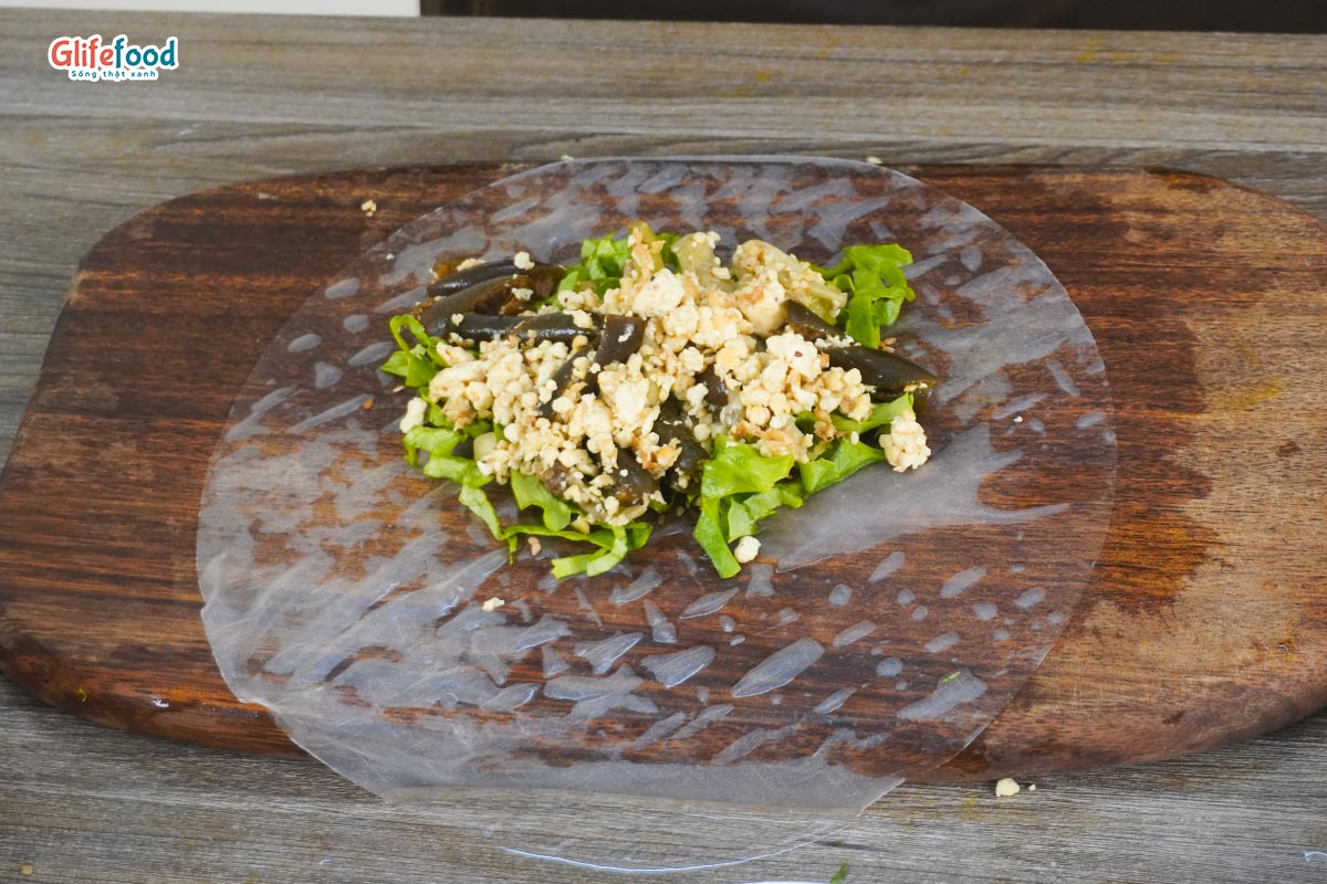 Cho một ít mè rang lên bánh tráng, tiếp theo là một lớp rau xà lách thái nhỏ, cuối cùng là nhân tảo biển Chile vừa xào lên trên rồi cuốn chặt tay.