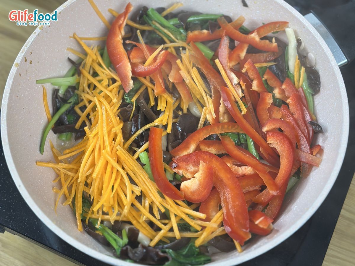 Bắc chảo lên bếp, cho các loại rau củ (cà rốt, ớt chuông, nấm, mộc nhĩ, rau cải) vào xào. Khi rau củ vừa chín tới, bạn rưới một ít nước xốt đã pha ở bước 2 vào, đảo đều để rau củ thấm vị và giữ được màu sắc tươi tắn.