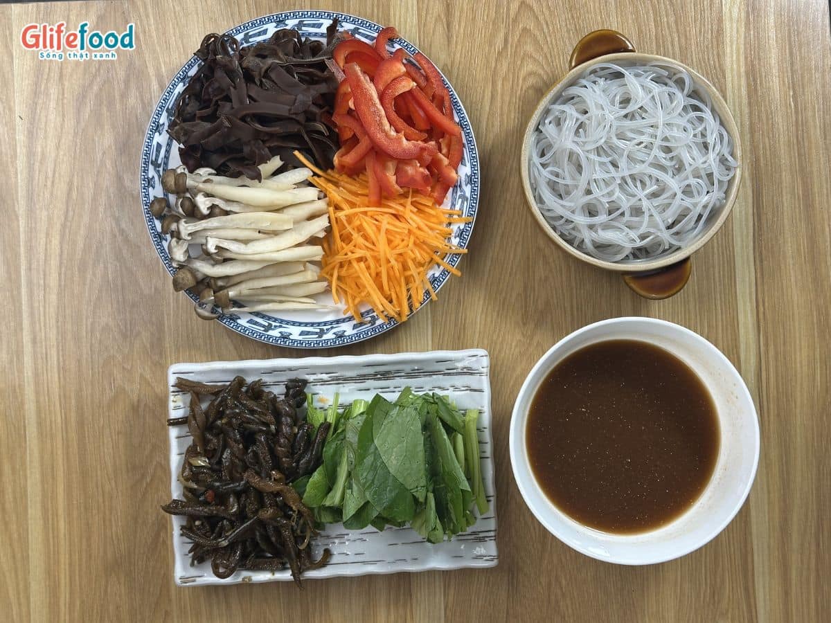 - Gia vị nước xốt: Nước tương, dầu hào chay, tương ớt, đường, hạt nêm chay, giấm gạo