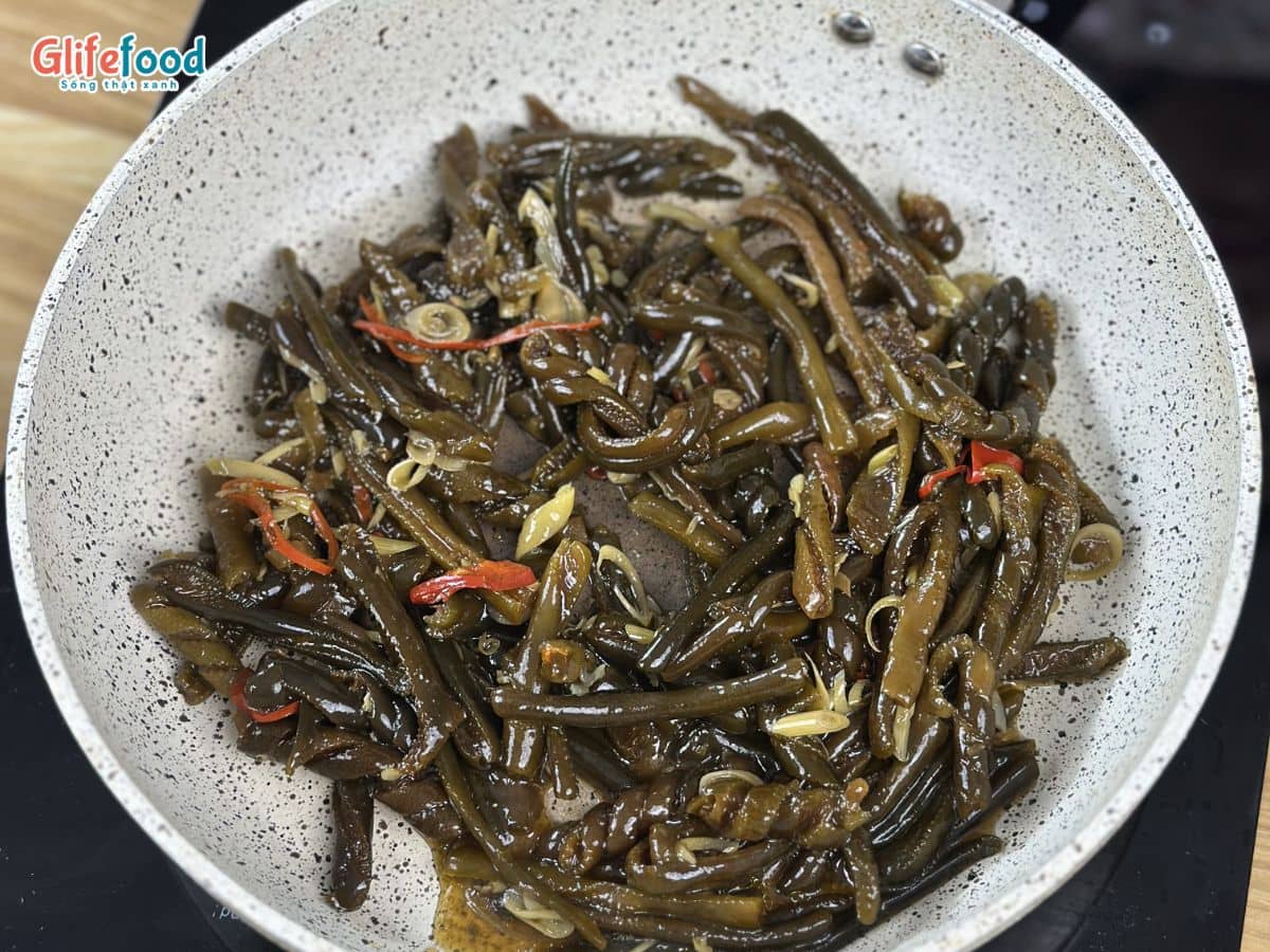 Tảo xoắn Chile Sewe sau khi sơ chế, đem xào chín tới với một chút hành tỏi phi thơm.