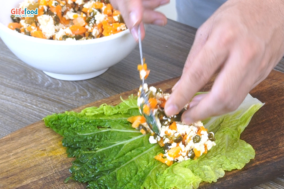 Trộn hỗn hợp đậu phụ, tảo băm, nấm hương. Thêm chút hạt nêm, hạt tiêu vừa ăn. Để ướp khoảng 30 phút trước khi đem cuộn với lá cải thảo.