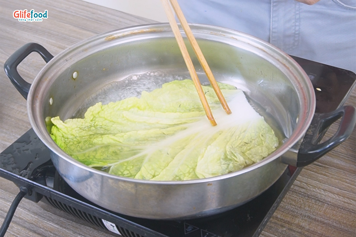 Cải thảo, hành lá: rửa sạch, trần sơ cho mềm. Sau đó vớt ra bát nước lạnh để rau không bị nát và dễ cuốn hơn