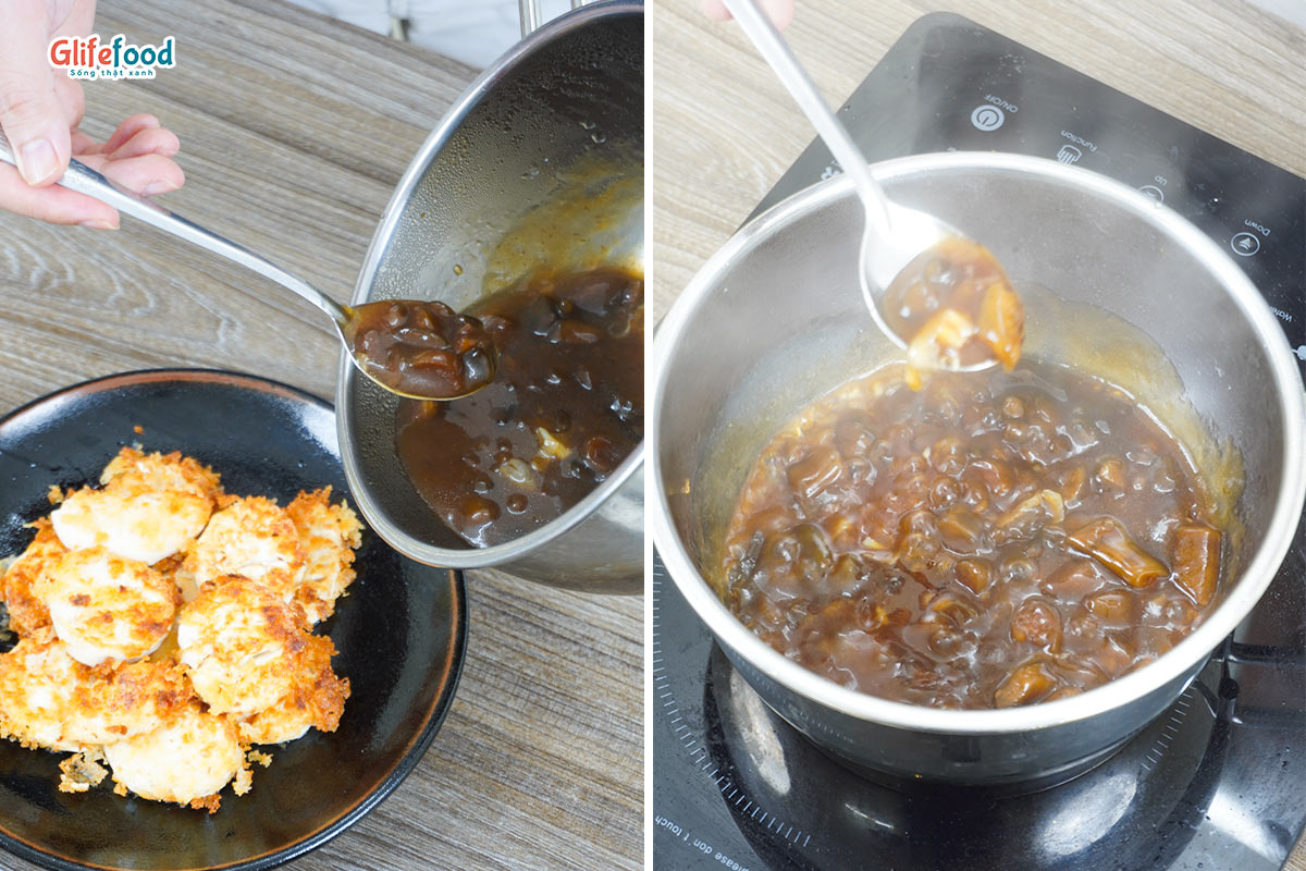 Sau đó cho 1/2 bát nước vào và nêm nếm gia vị (3 muỗng canh nước tương, 2 thìa hạt nêm, 2 thìa cf đường). Đợi nước sôi thì thêm 1 muỗng canh bột bắp pha loãng. Sốt sệt lại thì tắt bếp.