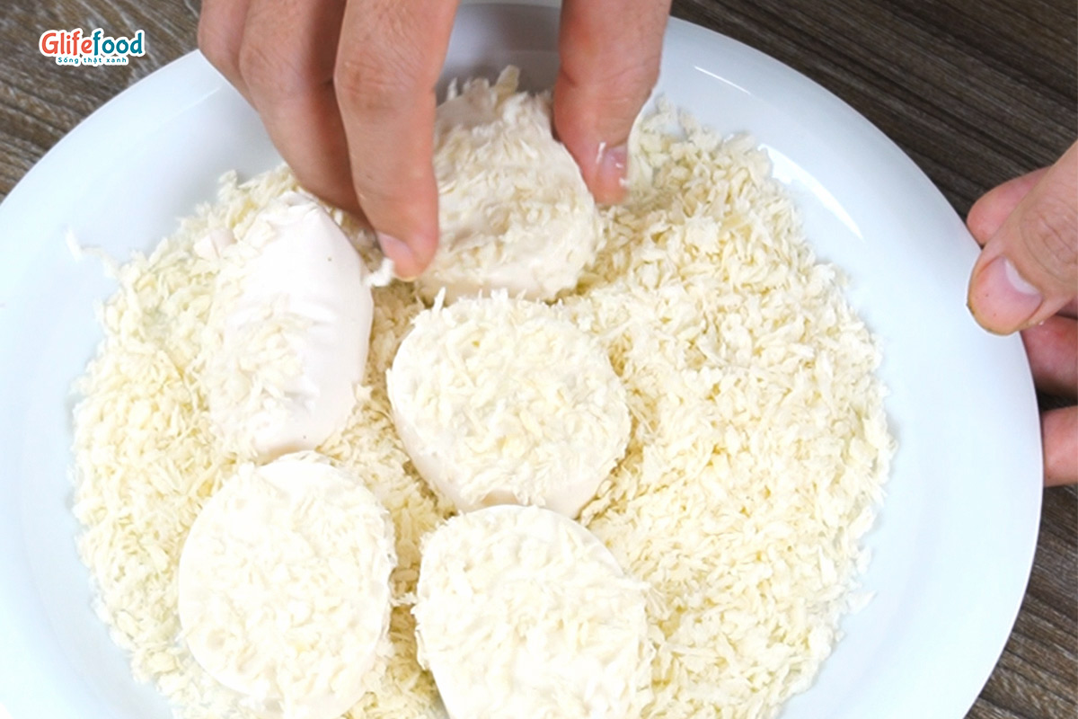 Đậu hũ non cắt miếng rồi lăn qua bột chiên xù.