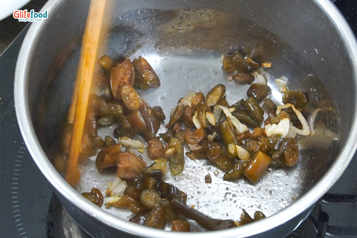 Xào thơm hành boa rô băm nhuyễn rồi cho tảo băm vào xào cùng.