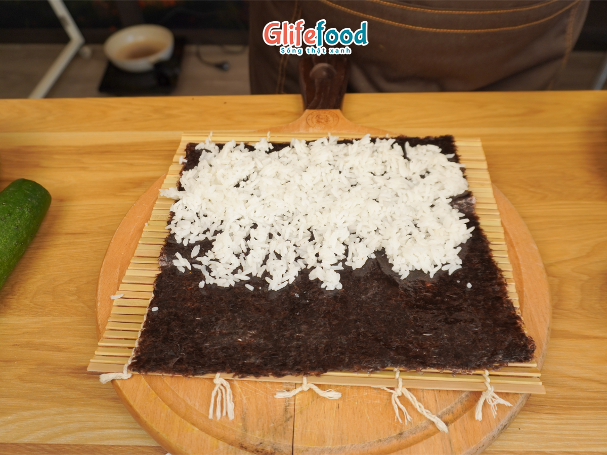 Dàn đều một lớp cơm mỏng lên khoảng 2/3 lá rong biển, nhớ chừa lại một phần mép lá để dán lại