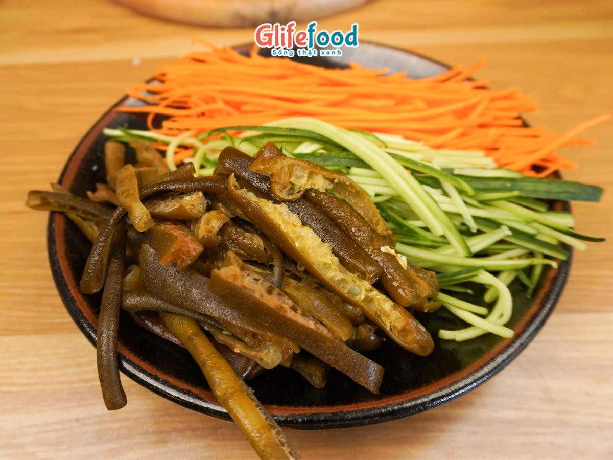 Cà rốt và dưa chuột rửa sạch, nạo thành sợi dài
