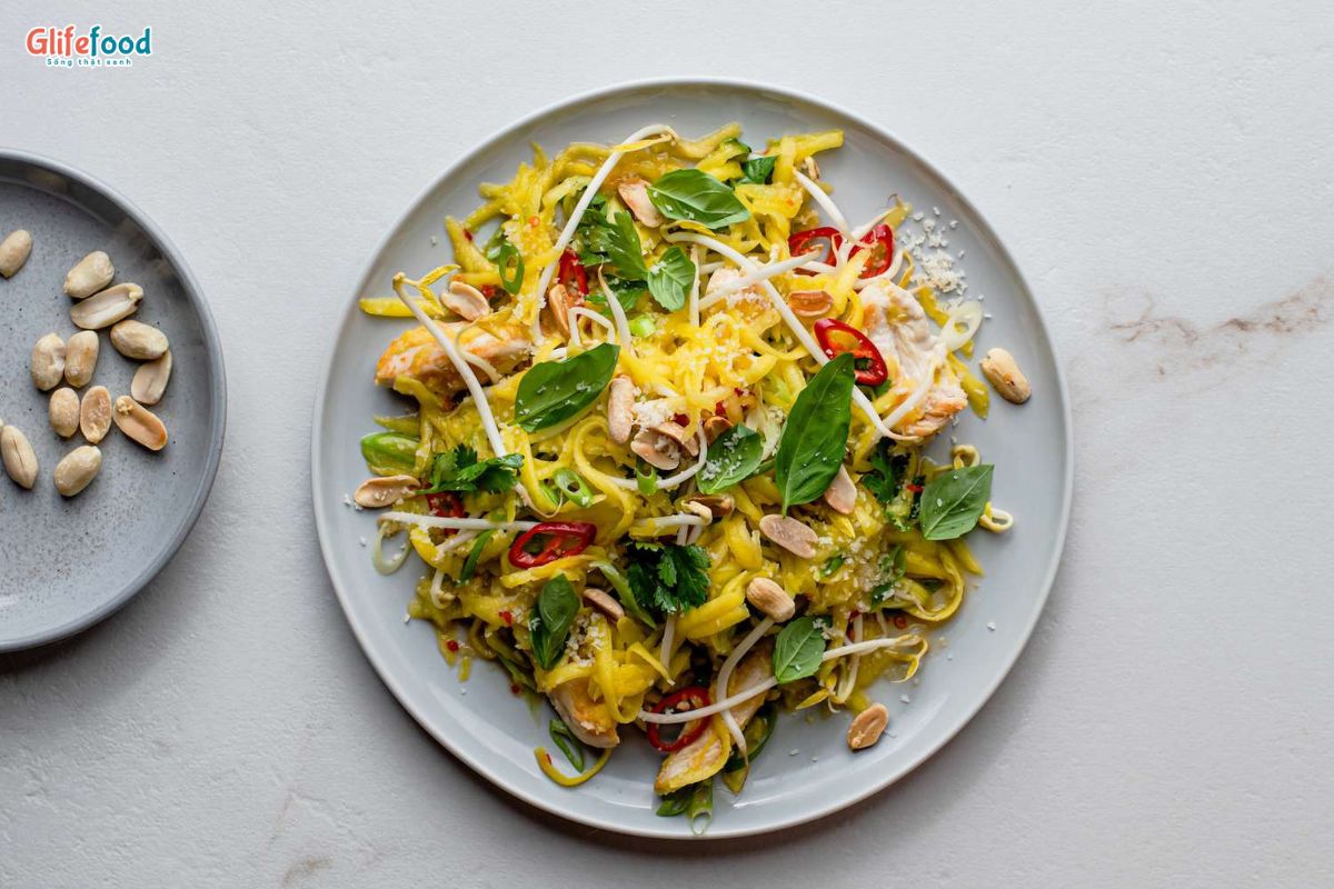 Cho xoài xanh, rau răm, sốt trộn vào bát và trộn đều. Cuối cùng thêm tảo xoắn vào bát.
