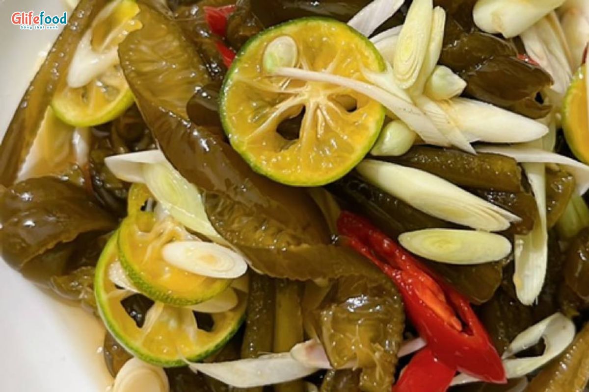 Cho tảo, ớt sừng, lá chanh, quất vào bát, rưới nước mắm chua ngọt lên và trộn đều rồi trình bày ra đĩa.