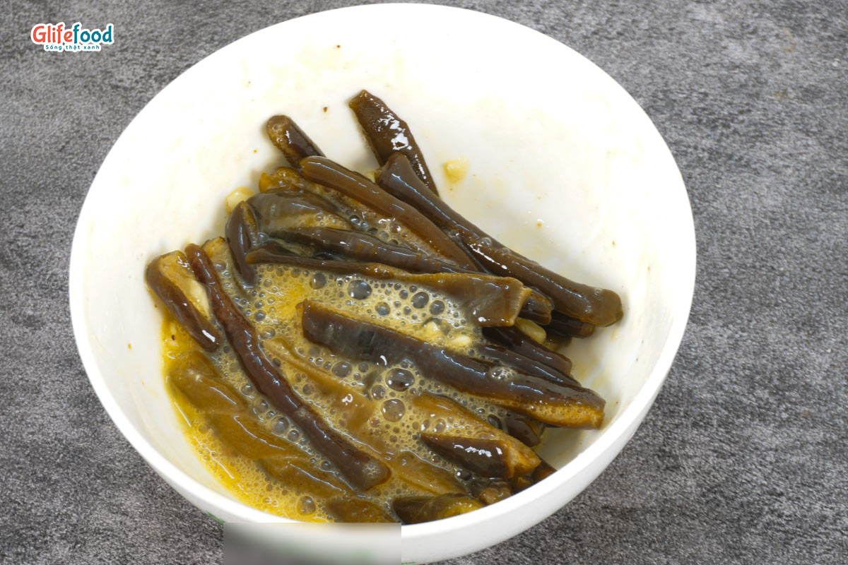 Tảo xoắn ướp với 0.5 muỗng hạt nêm, 0.5 muỗng bột ngọt, 1 muỗng tiêu, dầu ăn, 1 muỗng tỏi xay, 1 quả trứng.