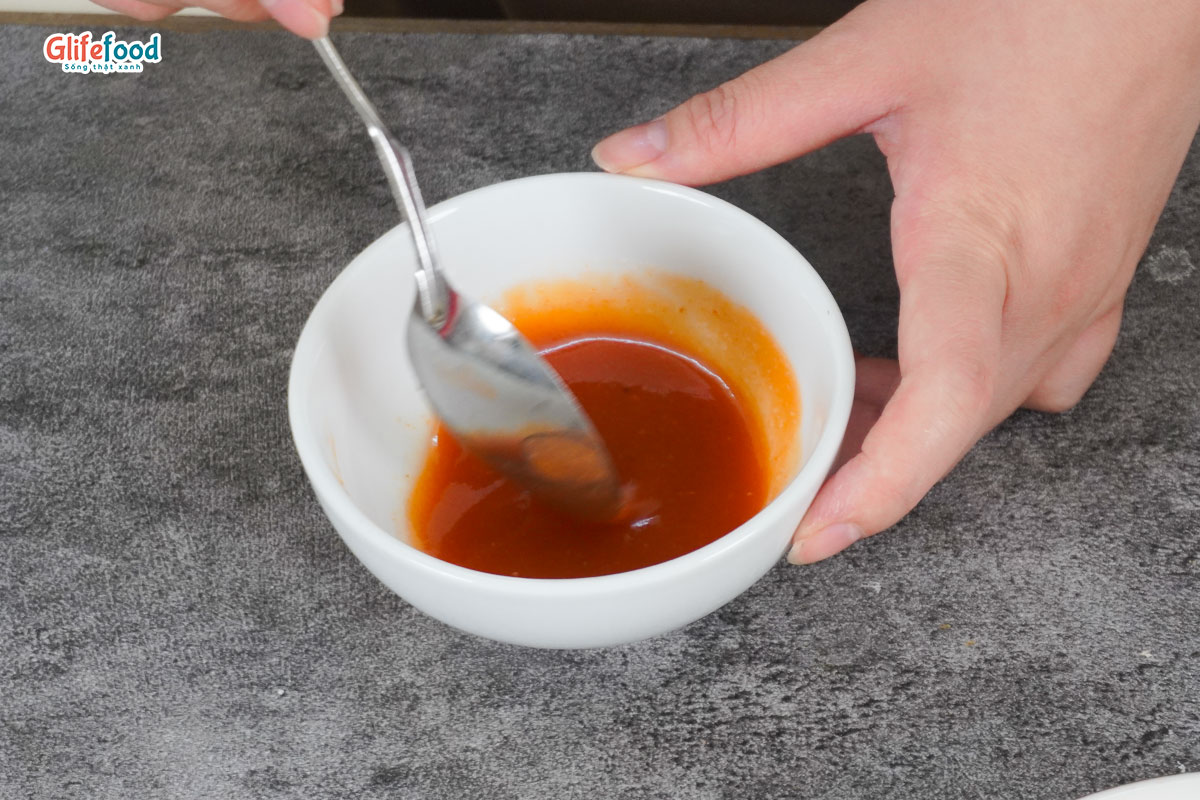 Sốt chua ngọt: 1 muỗng đường, 0,5 muỗng hạt nêm, ` muỗng giấm gạo, 0,5 muỗng tương cà, 1 muỗng tương ớt.