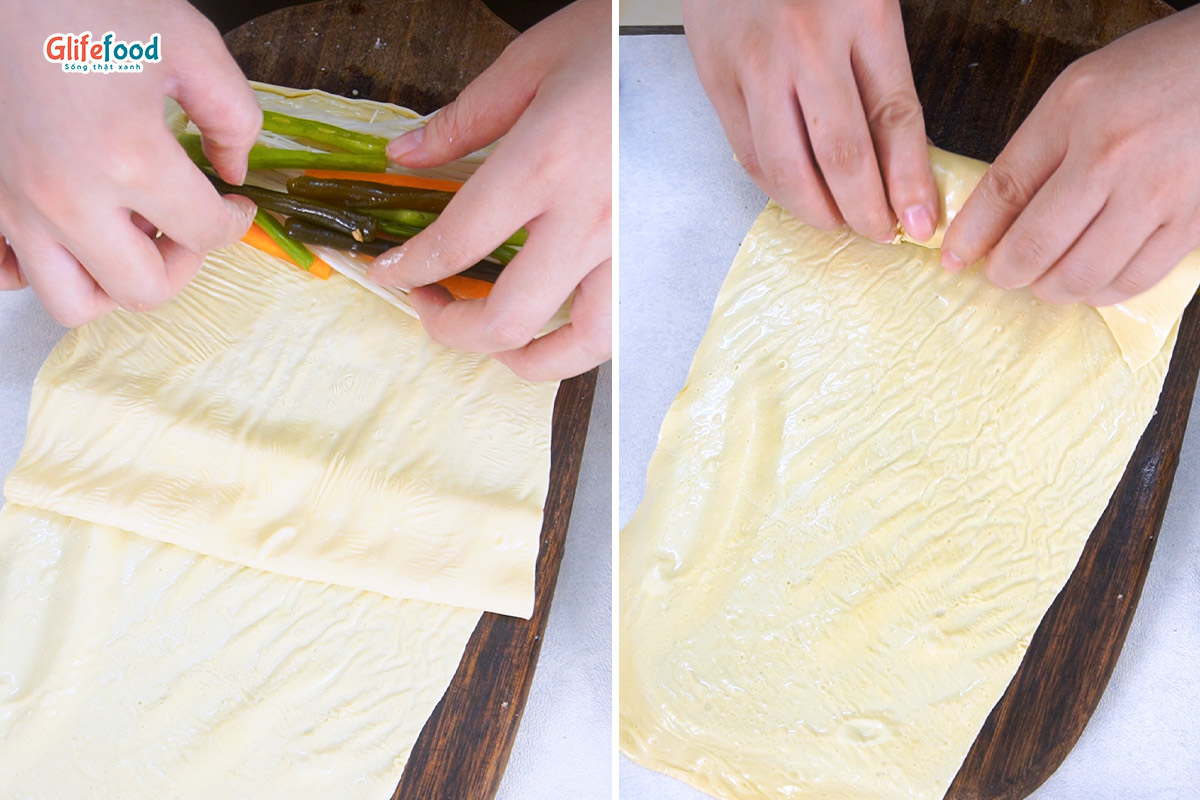 Cho tảo xoắn, cà rốt, đậu que vào miếng váng đậu rồi cuộn chặt tay