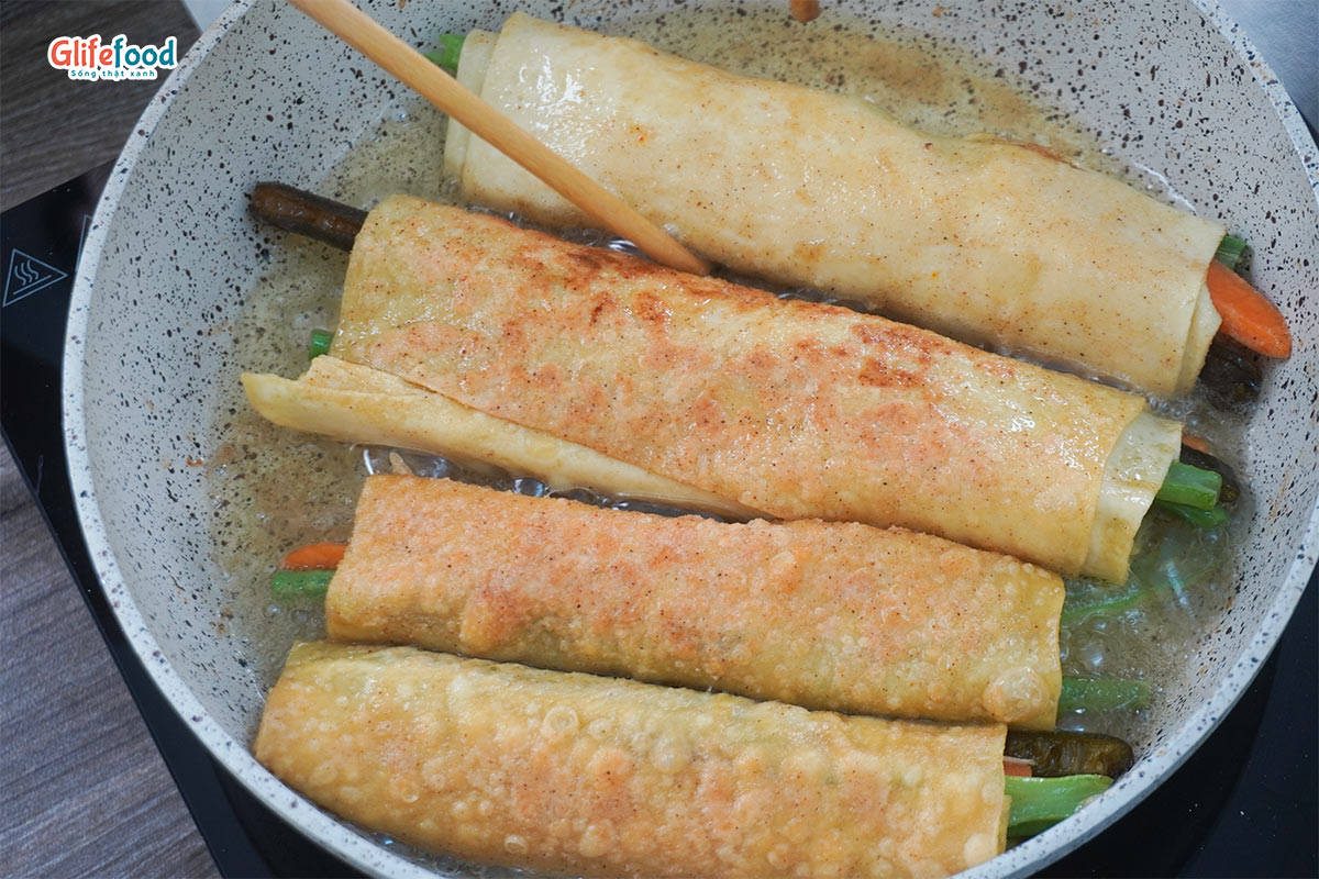 Cho tảo xoắn, cà rốt, đậu que vào miếng váng đậu rồi cuộn chặt tay. Tiếp theo lăn miếng váng đậu qua một lớp bột chiên giòn.