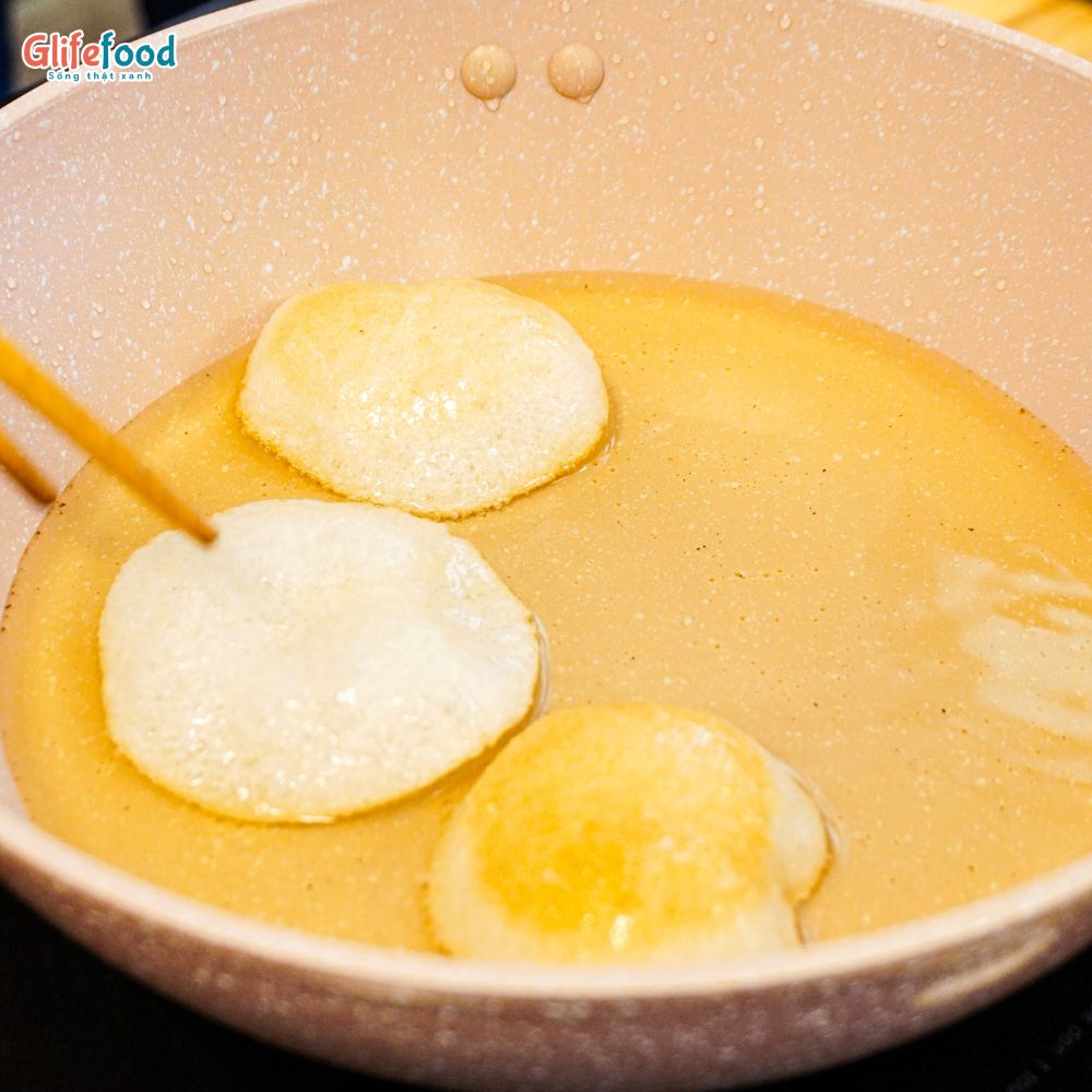 Bước 2: Thả từng miếng bánh phồng vào, bánh sẽ nhanh chóng nở đều và chuyển màu vàng đẹp mắt.